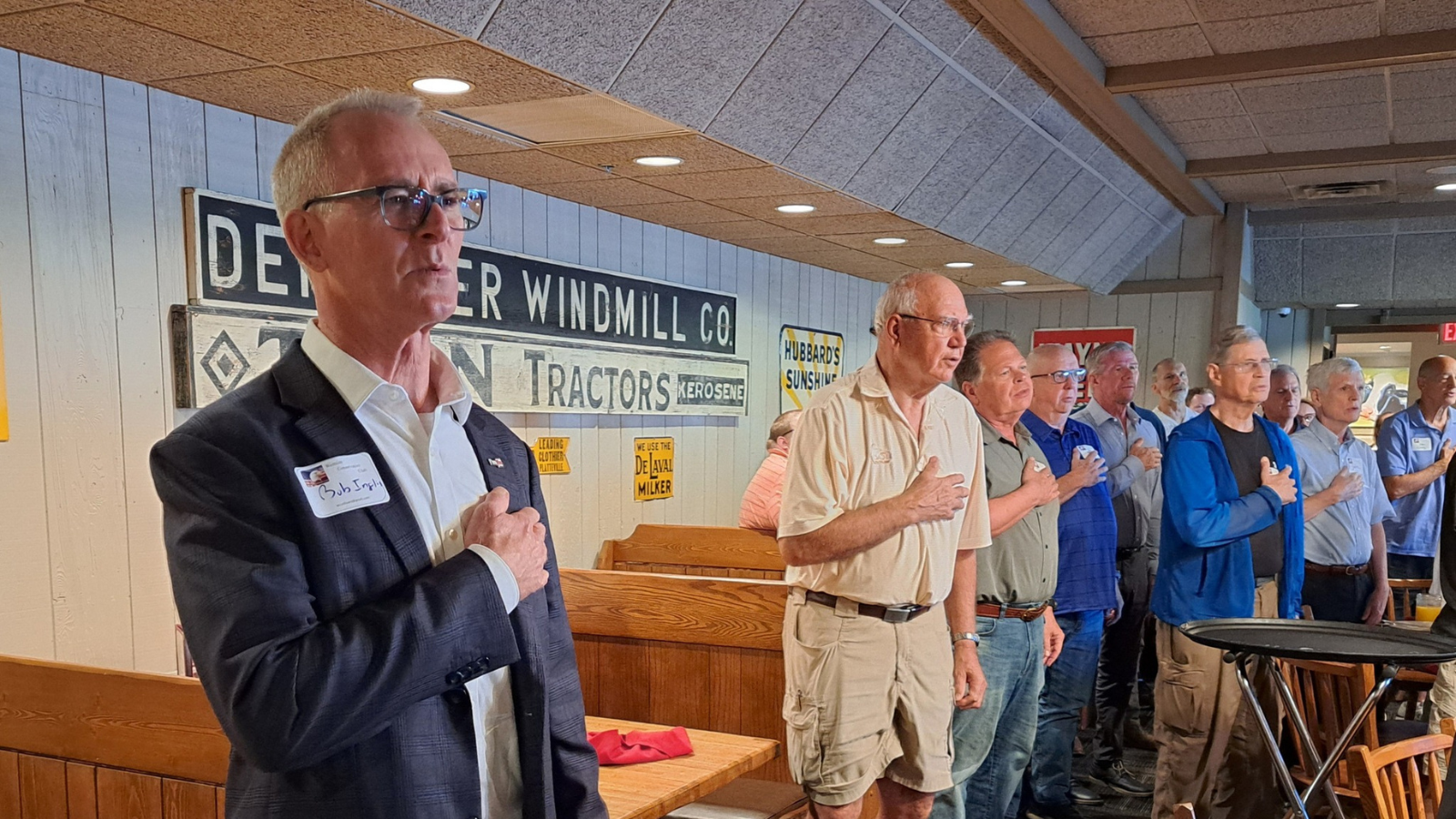 Bob Inglis joins members of Iowa’s Westside Conservative Club in the Pledge of Allegiance to open their July 23, 2025 meeting.