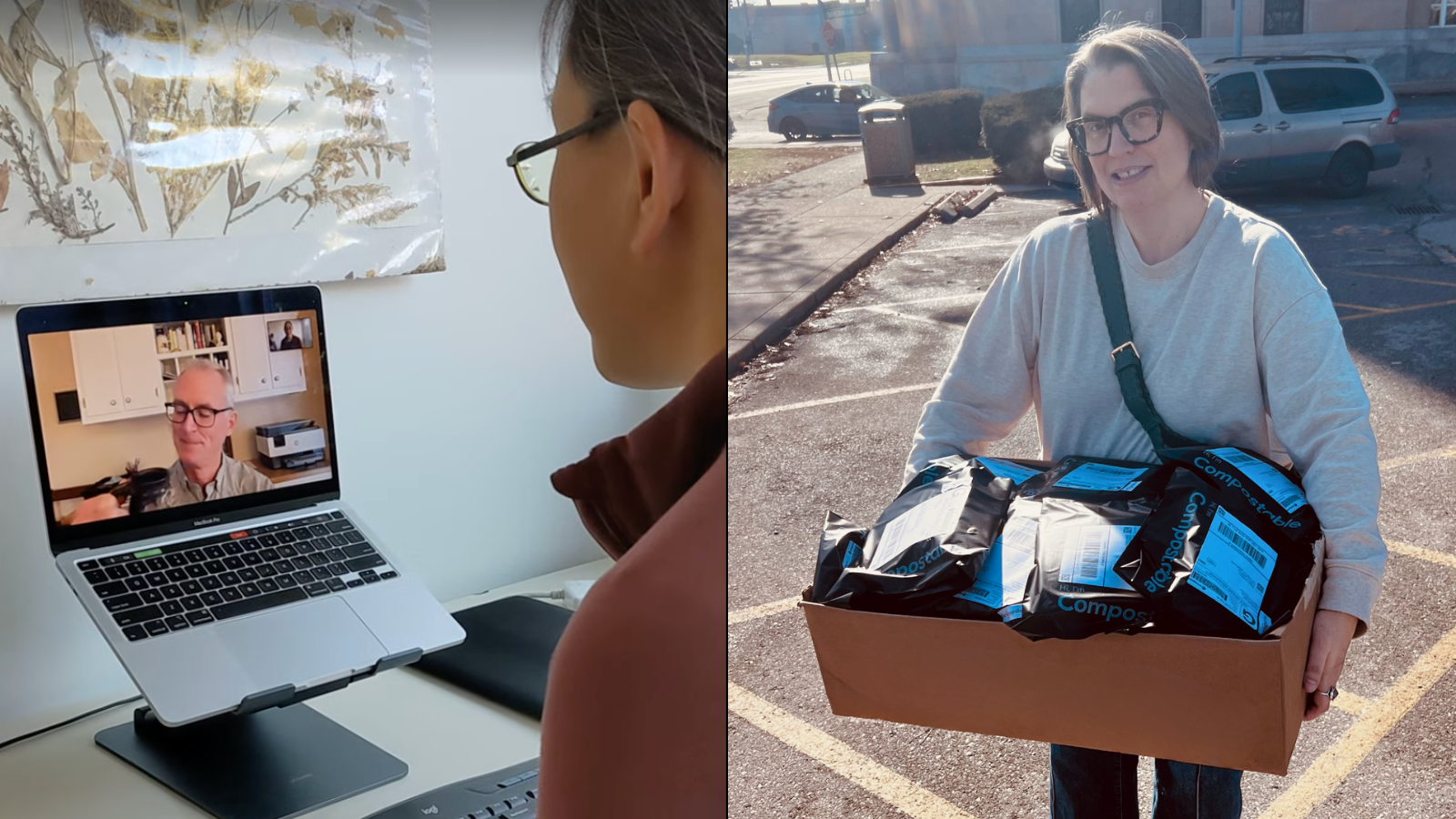 Behind the scenes at republicEn: Outreach Director Wen Lee records a Zoom conversation with Bob Inglis for the organization’s year-end appeal video, while Engagement Director Angela Larck delivers packages to the U.S. Post Office containing “Carbon Tax Advocate” republicEn socks for EcoRight VIPs.